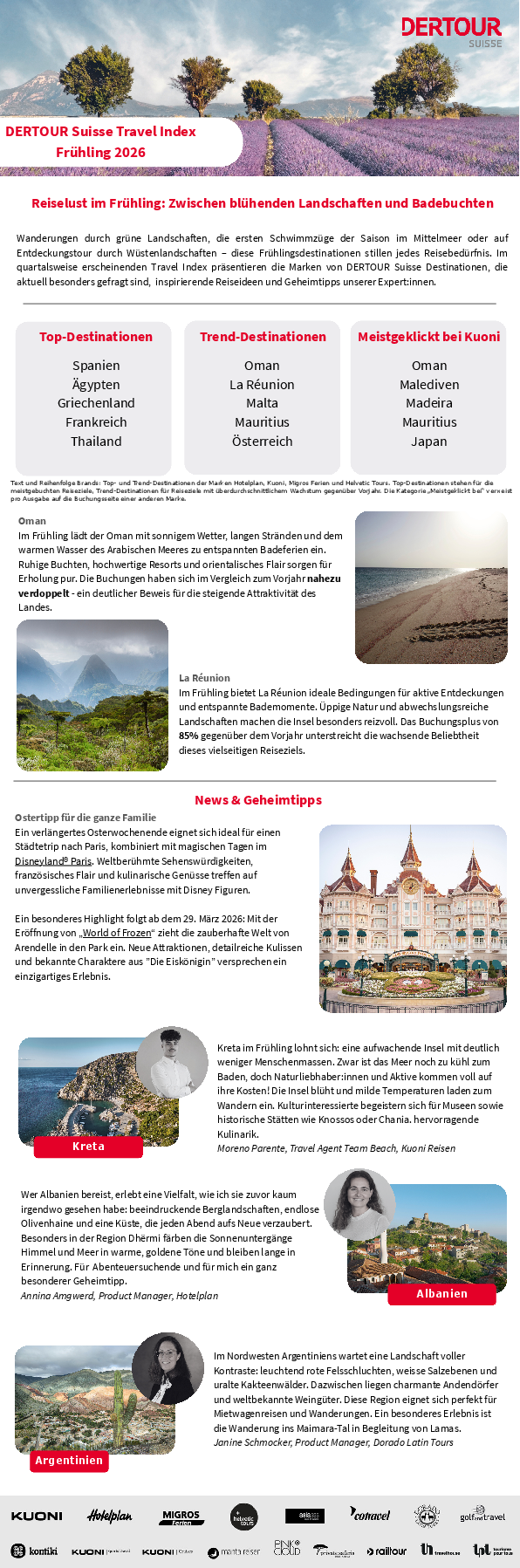 Im quartalsweise erscheinenden Travel Index präsentieren die Marken von DERTOUR Suisse Reise- sowie Buchungstrends, inspirierende Ferienideen und Geheimtipps.